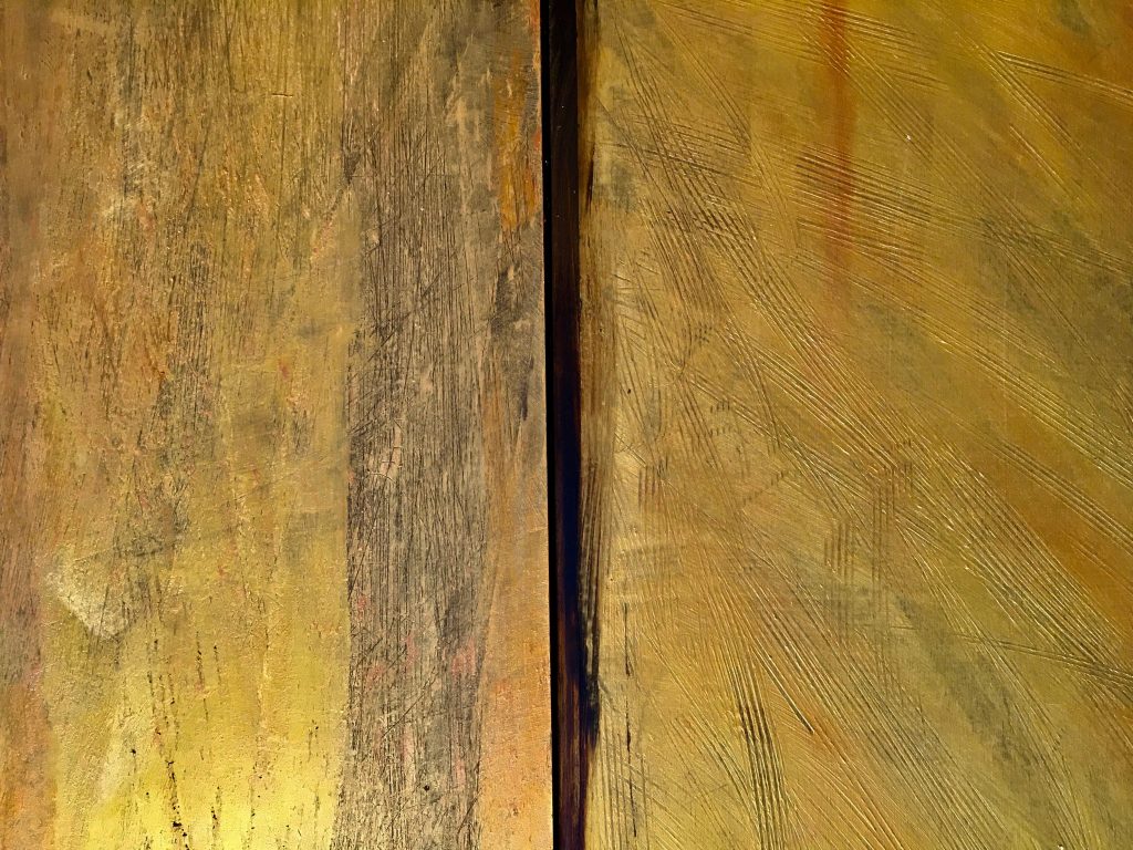 Mit seiner ganzen Kraft sucht der Mensch, dem Leben Sinn zu geben. Wir kommen in diese Welt und verlassen sie wieder. Wenn ein Mensch von uns geht, sind wir – vorbereitet oder auch unvorbereitet – mit einer Wirklichkeit konfrontiert, die früher oder später auf alle Lebewesen zukommt. Die Zeit scheint still zu stehen. Wir stehen gewissermaßen vor einem großen, geheimnisvollen Portal. Dieses Tor hat kein Schloss, lässt sich von uns nicht öffnen. Gleichzeitig sehnen wir uns danach, dass sich ein neuer Raum auftut, die Verbindung zu den Unsrigen nicht abbricht. In der Mitte des Bildes ist ein langer schmaler Spalt zu erkennen, einem Riss nachempfunden, wie eine offene Wunde. Lassen wir uns durch diese Wunde berühren und hindurchführen?